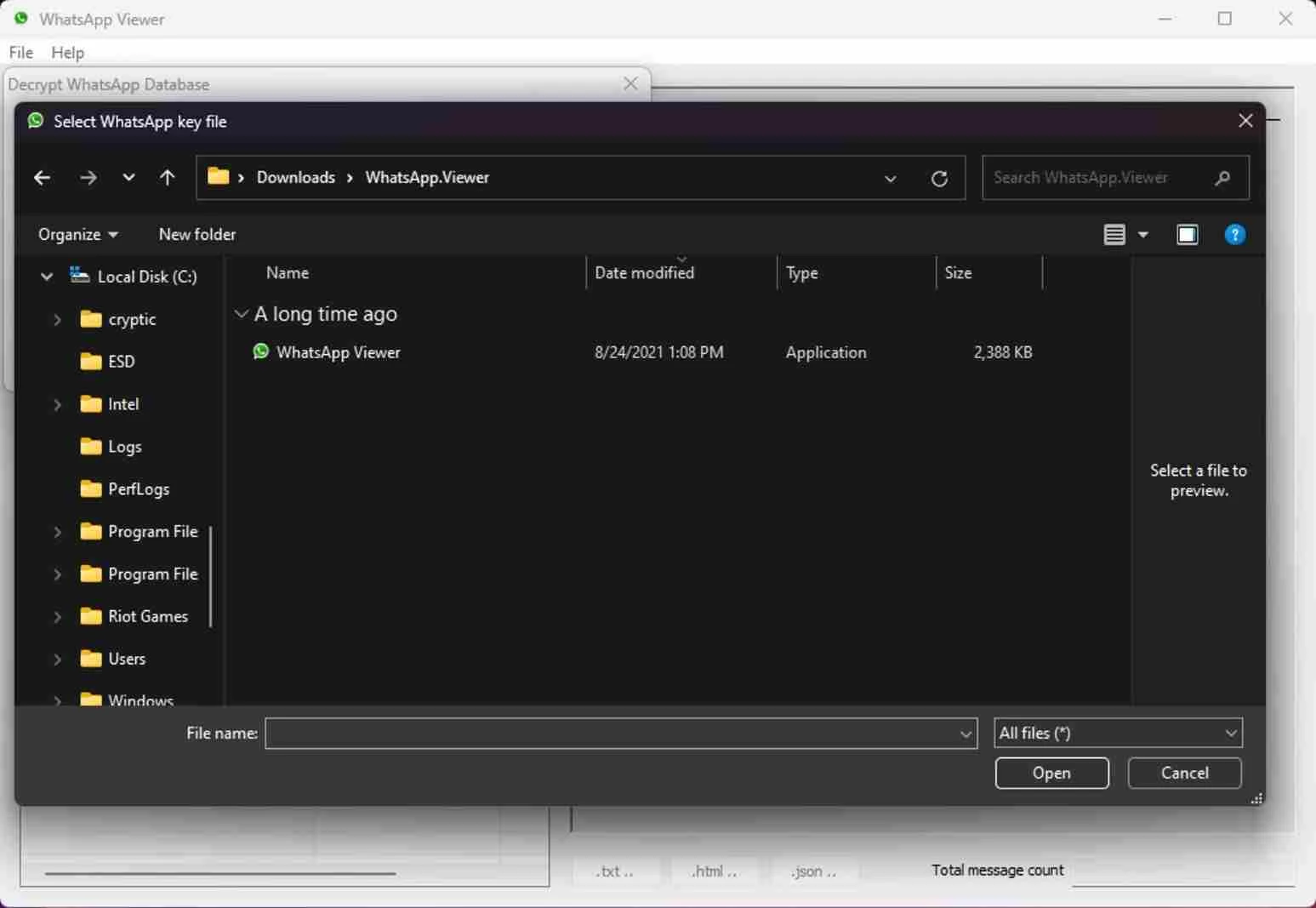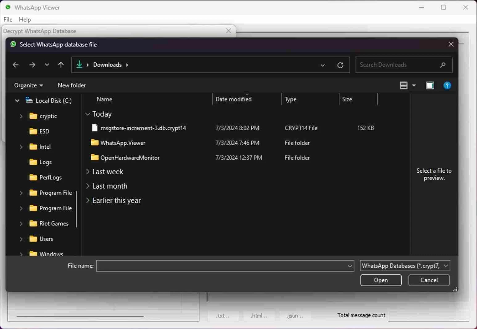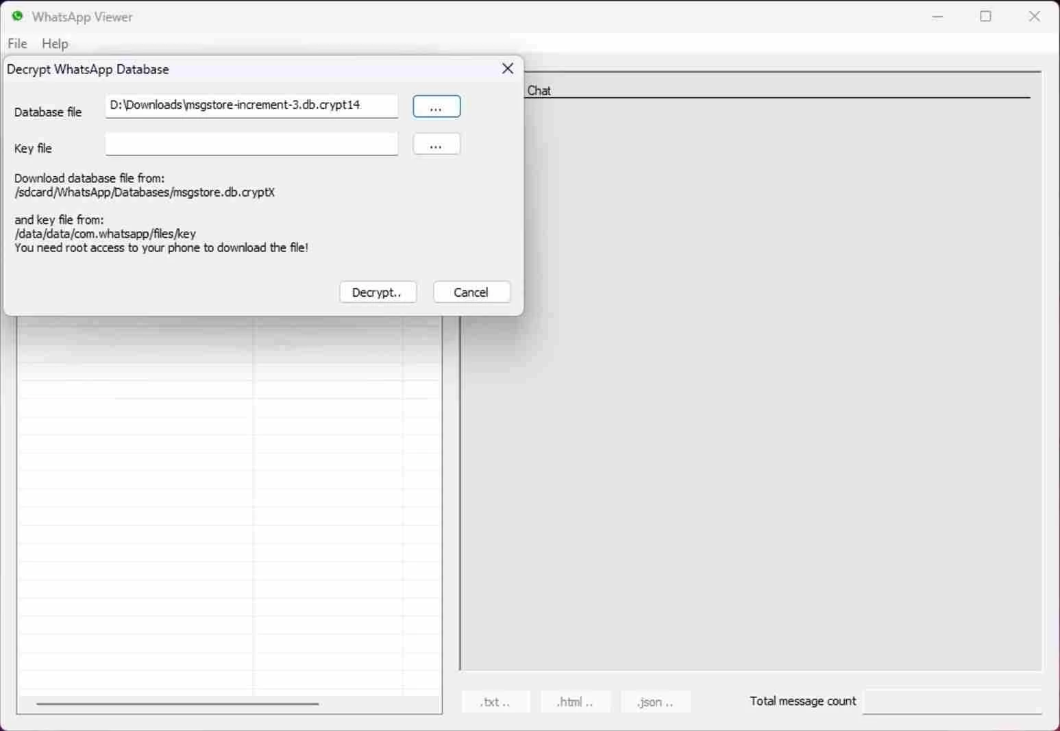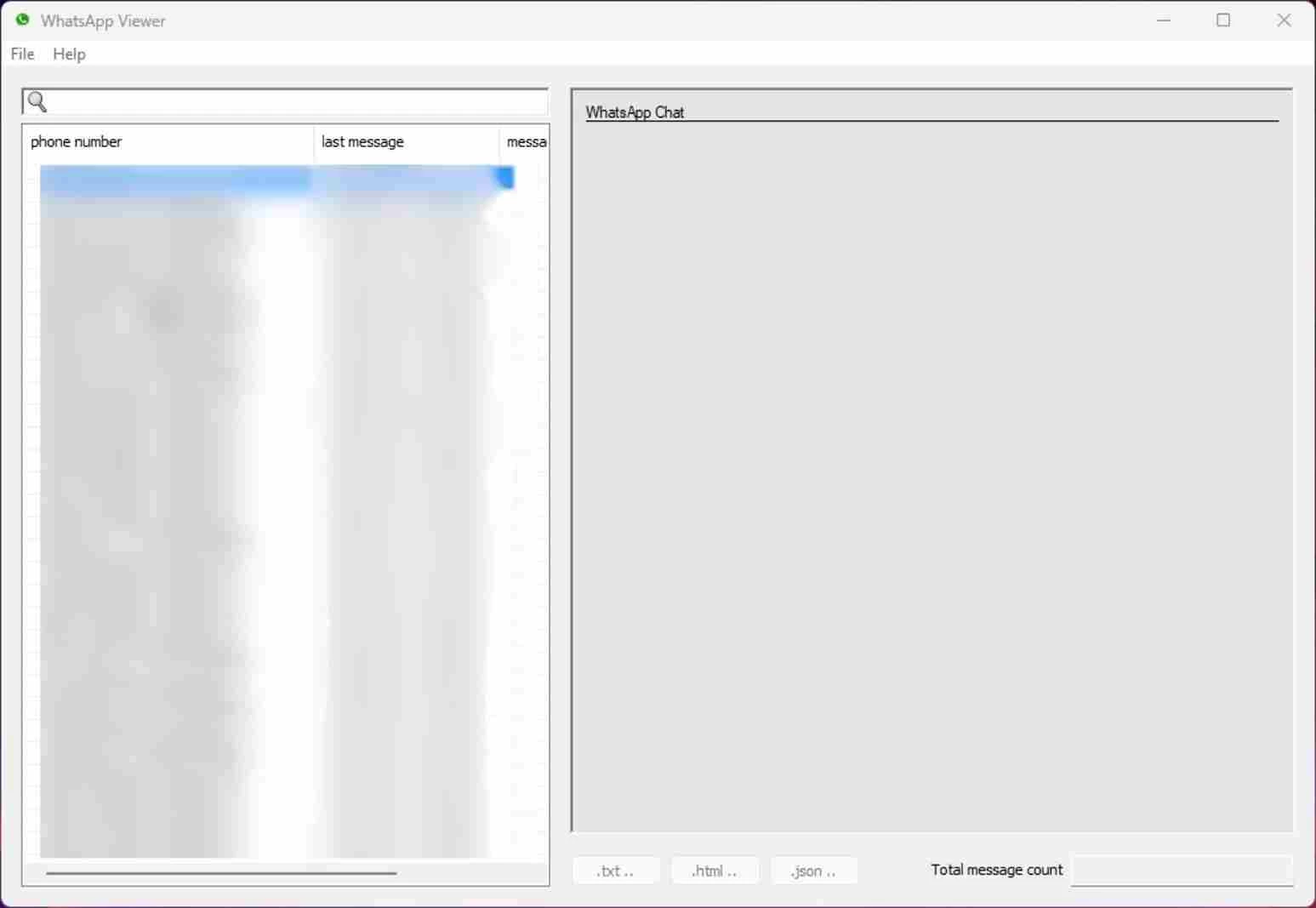 WhatsApp Viewer est le meilleur programme pour exporter vos messages WhatsApp vers votre ordinateur sans connexion réseau. L'application affiche les conversations en téléchargeant Android msgstore.db et prend en charge Crypt 5, Crypt 7, Crypt 8 et Crypt 12. Sauvegardez et recherchez vos messages WhatsApp sans installer la bibliothèque Crypt.